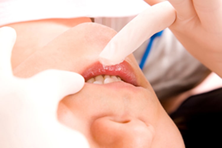 刺入部位の歯ぐきに表面麻酔を事前に塗布することで、その痛みの軽減を図ります。表面麻酔を行う際は、口内に麻酔液が流れないようにし、唾液を遮るためのガーゼとコットンを入れて行います。