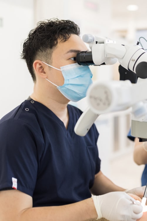 肉眼だと神経や感染組織の取り残しがおこって、治療後に強い痛みやトラブルの再発を招く恐れがあります。根管治療を繰り返せばそれだけ歯根の厚みが失われ、ヒビや破折がおこりやすくなることから1回目の治療の質が非常に重要です。当院では、マイクロスコープを使って視野を何倍にも拡大し、治療の精度を高める工夫を行っています。リスクを最小限に抑えたい方は、お気軽にご相談ください。